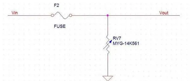 如上圖,這是保險絲在壓敏電阻之前,當(dāng)有高電壓(比如雷擊)從Vin過來時,瞧瞧會是什么結(jié)果,應(yīng)該是壓敏電阻毀壞,保險絲也斷掉。分析根本原因:Vin有高電壓時,壓敏電阻RV7短路,這時電流經(jīng)過保險絲立即跟地短路了,定會產(chǎn)生非常大的電流。保險絲絕對斷掉。因此 ,保險絲跟壓敏電阻是同時壞掉