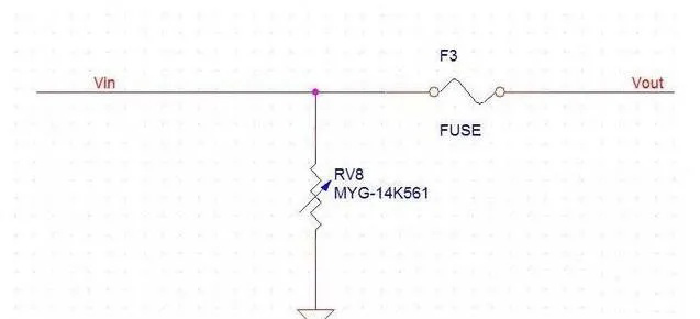 第一種情況是Vin有高電壓(比如雷擊)過來時,這時壓敏電阻RV8短路,保險絲F3這里沒有大電流經(jīng)過,因此 保險絲不會斷。后邊的電路也不會毀壞,這時是壓敏電阻毀壞,保險絲沒有問題。