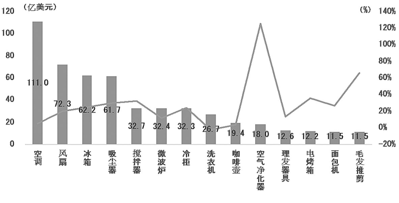 2020 年1~12月小家電及零件出口533.9億美元,較上年同比增長(zhǎng)26.1%。與居家抗疫相關(guān)度高的攪拌榨汁類產(chǎn)品,電炒鍋、電烤箱及面包機(jī)等廚房小家電,以及電推剪產(chǎn)品需求明顯增多,從第二季度開(kāi)始持續(xù)增長(zhǎng)。其中攪拌器和榨汁機(jī)出口量較上年同期分別增長(zhǎng)29.6%和24.5%;微波爐、電炒鍋、電烤箱及面包機(jī)出口量較上年同期分別增長(zhǎng)12.7%、24.7%、28.2%和17.2%;電推剪出口量較上年同期增長(zhǎng)37.1%。空氣凈化器、加濕器等產(chǎn)品近年來(lái)本就處在上升期,再受到疫情居家因素拉動(dòng),出口大幅增長(zhǎng),空氣凈化器、加濕器、干洗機(jī)、洗碗機(jī)分別較上年同期增長(zhǎng)74.7%、36.9%、32.8%和28.8%。