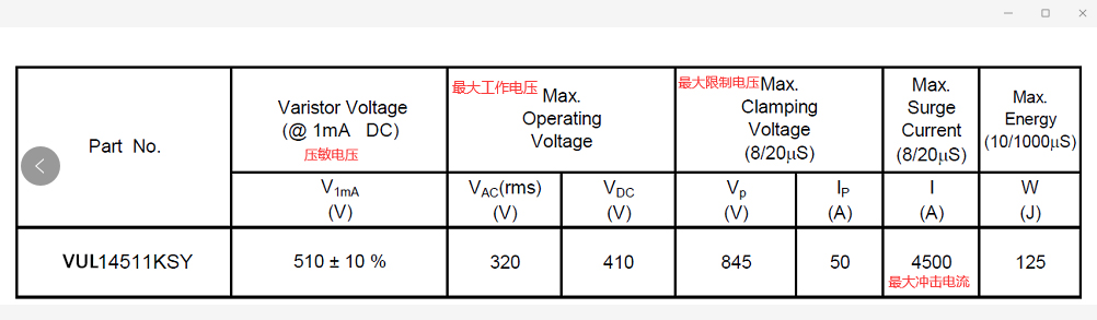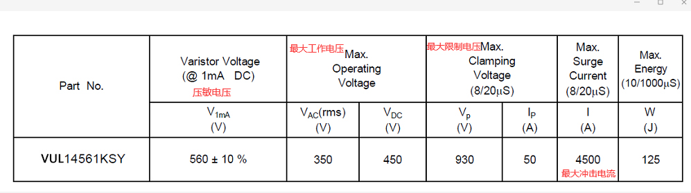 2. 關(guān)于壓敏選型,例如220V的工作電壓,由于電網(wǎng)有波動(dòng)因素,我們經(jīng)驗(yàn)的需要,加上一個(gè)安全系數(shù)。公式:220*1.414=311,得出311V的工作電壓,那么選用的壓敏工作電壓就要大于我們得出的電網(wǎng)工作電壓311V。如下圖產(chǎn)品TVR14511KSY的工作電壓VAC是320V,大于電網(wǎng)工作電壓311V,那么我們就可以選用這款壓敏電阻。但是根據(jù)環(huán)境電壓波動(dòng),可以選用工作電壓再大一點(diǎn)的壓敏電阻,如下圖產(chǎn)品TVR14561KSY,這樣就會(huì)更保險(xiǎn)。