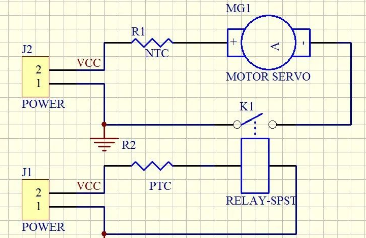 在此電路中,R2是PTC電阻,R1是NTC電阻,K1是繼電器,MG1是電機(jī)