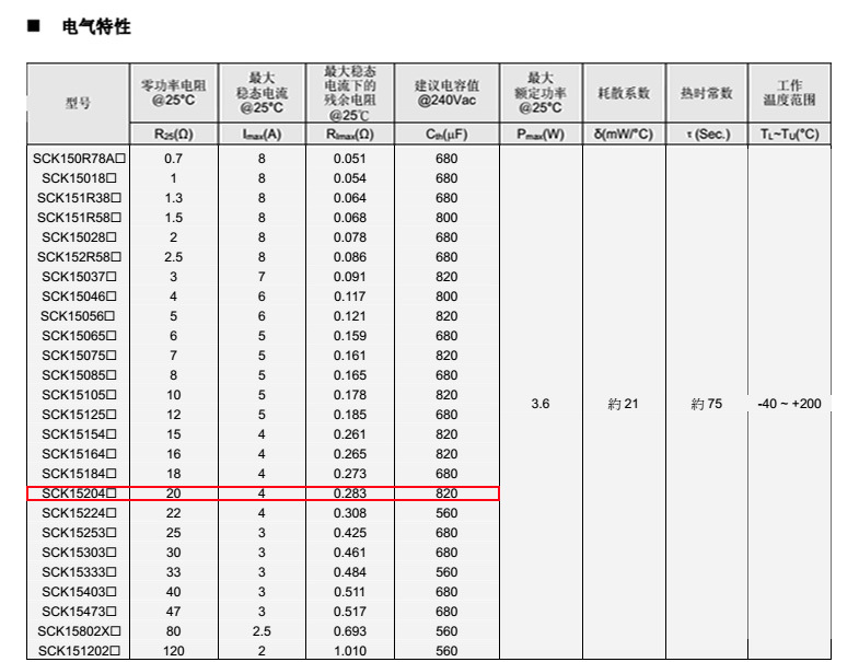 熱敏電阻: 穩(wěn)騰 熱敏電阻型號: SCK15204MSY 熱敏電阻片徑: Φ15mm 零功率電阻@25℃: 20Ω 工作溫度范圍: -40℃±200℃ 儲存溫度范圍: -40℃±85℃
