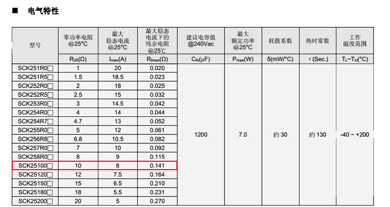 熱敏電阻: VT 熱敏電阻型號(hào): SCK25100MSY 熱敏電阻片徑: Φ25mm 零功率電阻@25℃: 10Ω 工作溫度范圍: -40℃±200℃ 儲(chǔ)存溫度范圍: -40℃±85℃