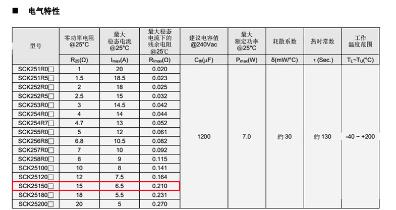 熱敏電阻: VT 熱敏電阻型號: SCK25150MSY 熱敏電阻片徑: Φ20mm 零功率電阻@25℃: 15Ω 工作溫度范圍: -40℃±200℃ 儲(chǔ)存溫度范圍: -40℃±85℃
