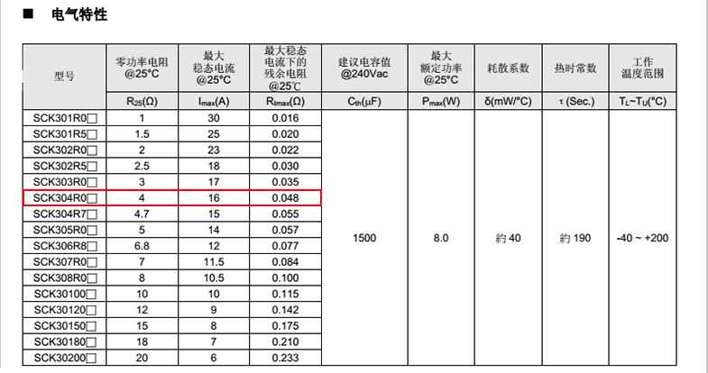 熱敏電阻: VT 熱敏電阻型號: SCK304R0MSY 熱敏電阻片徑: Φ30mm 零功率電阻@25℃: 4Ω 工作溫度范圍: -40℃±200℃ 儲存溫度范圍: -40℃±85℃