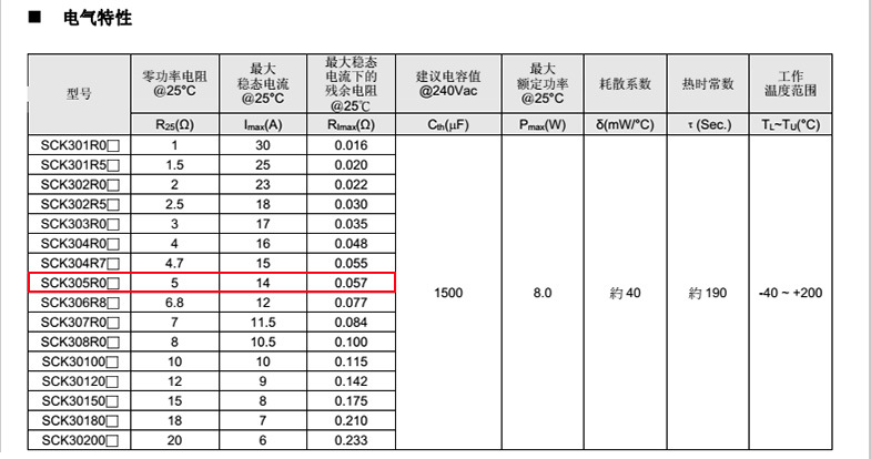 熱敏電阻: VT 熱敏電阻型號(hào): SCK305R0MSY 熱敏電阻片徑: Φ30mm 零功率電阻@25℃: 5Ω 工作溫度范圍: -40℃±200℃ 儲(chǔ)存溫度范圍: -40℃±85℃