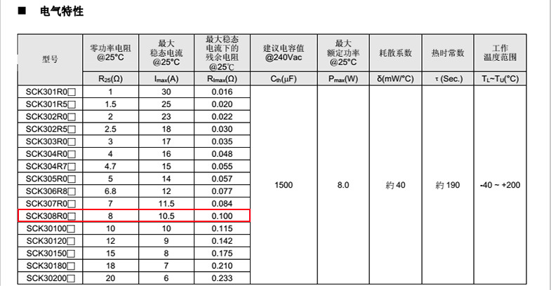 熱敏電阻: VT 熱敏電阻型號: SCK308R0MSY 熱敏電阻片徑: Φ30mm 零功率電阻@25℃: 8Ω 工作溫度范圍: -40℃±200℃ 儲(chǔ)存溫度范圍: -40℃±85℃