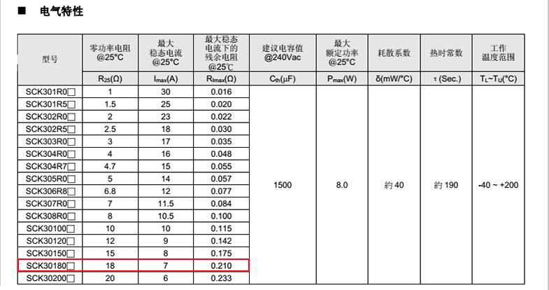 熱敏電阻: VT 熱敏電阻型號: SCK30180MSY 熱敏電阻片徑: Φ30mm 零功率電阻@25℃: 18Ω 工作溫度范圍: -40℃±200℃ 儲存溫度范圍: -40℃±85℃