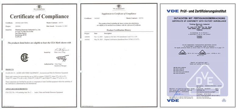 認(rèn)證包括:UL、CUL、VDA、CSA、CQC、 SGS